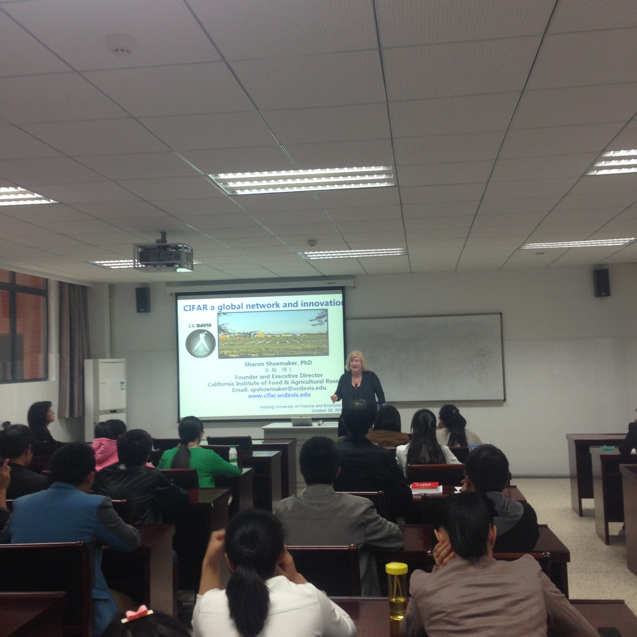2013年10月28日下午,应我院邀请,加州大学戴维斯分校食品和农业研究所所长Sharon Shoemaker博士来到我院做了题为《CIFAR─A global network and innovation》的学术报告,我校国际学院院长邱伟芬、我院副院长王立峰和部分教师、全体在校研究生参加了讲座。讲座由国际交流处处长邱伟芬主持。