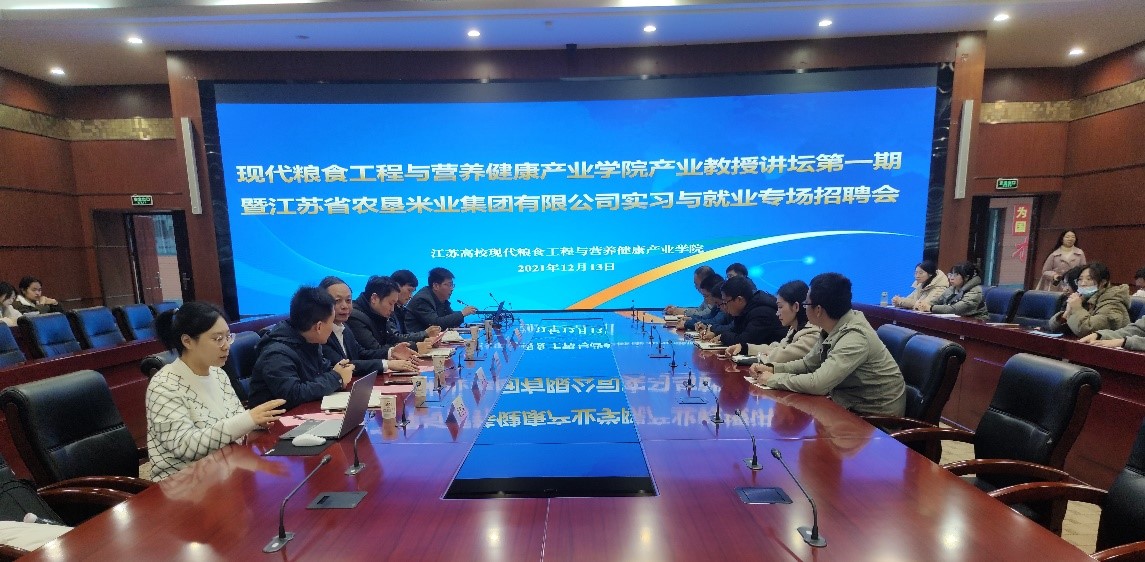 12月14日,我院在工科楼会议室召开现代粮食工程营养与健康产业学院产业教授讲坛第一期暨江苏省农垦米业集团有限公司实习与就业专场招聘会。江苏省农垦米业集团有限公司党委书记、董事长,江苏省产业教授宗兆勤等集团领导应邀出席,食品科学与工程学院、现代粮食工程与营养健康产业学院院长方勇出席会议。学院系主任、实验中心主任和毕业班的研究生、本科生积极参会。会议由我院副院长丁超主持。