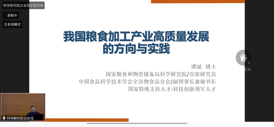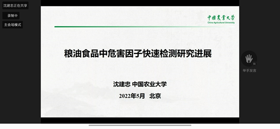 2022年5月23日下午三点至五点,我院部分老师及研究生参加了2022年全国粮食和物资储备科技活动周的“粮科大讲堂”,中国工程院院士沈建忠教授、中国食品科学技术学会常务理事谭斌研究院分别对“粮油中危害因子快速检测研究进展”、“我国粮食加工产业高质量发展的方向与实践”进行了分享汇报,国家粮食和物资储备局督查专员李成毅主持本次会议。