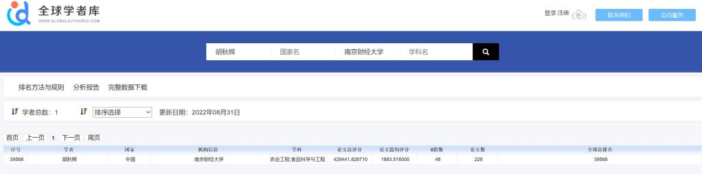 近日,《2022全球学者学术影响力排行榜》正式发布。其中,中国食品科学与工程学科共有110名专家上榜,我院胡秋辉教授进入榜单。网站公布的统计数据显示,胡秋辉教授论文总评分429441.826710、论文篇均评分1883.516000、H指数48、论文数228,全球总排名第39568名。