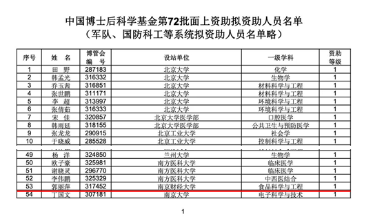 日前,中国博士后科学基金会博士后基金管理处公布了中国博士后科学基金第72批面上资助拟资助人员名单,我院食品科学与工程学院师资博士后郭丽萍获批一等资助。这是本批次资助名单中食品领域唯一的面上一等科学基金资助,也是我校第一个中国博士后科学基金一等资助。