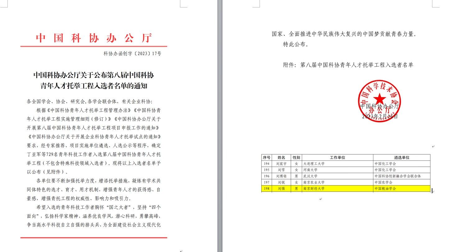 近日,中国科协办公厅公布了第八届“青年人才托举工程”入选名单,我院刘强博士在粮油及其食品储藏领域取得了创新性研究贡献,经专家推荐、项目实施单位遴选、人选公示等程序,成功入选中国科协青年人才托举工程,这是我校青年教师首次获此殊荣。