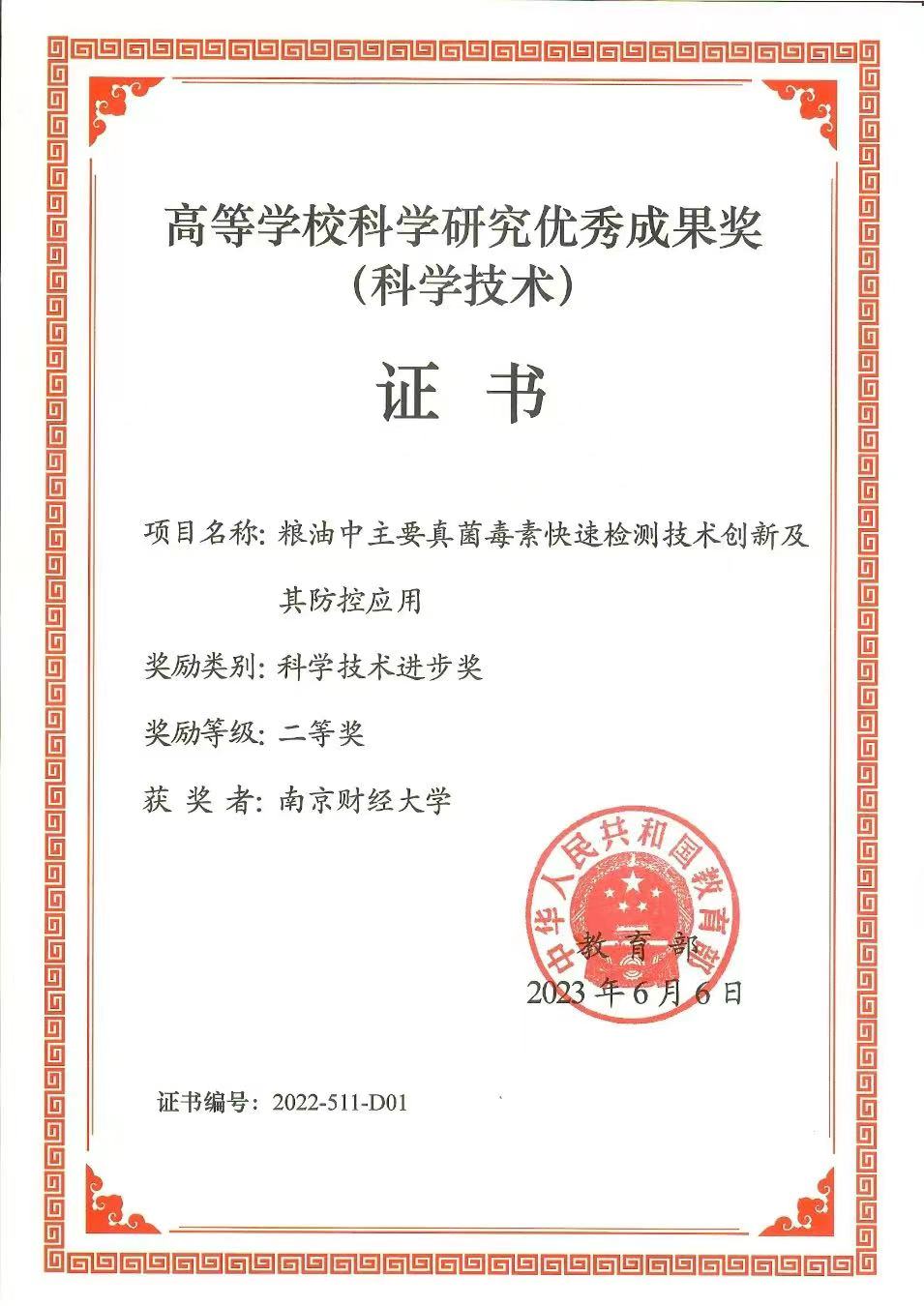近日,教育部颁发了高等学校科学研究优秀成果奖(科学技术)获奖成果证书,我院方勇教授团队领衔完成的“粮油中主要真菌毒素快速检测及其防控技术创新应用”项目,荣获2022年度教育部高等学校科学研究优秀成果奖科技进步奖二等奖(我院成员:方勇、沈飞、李彭、裴斐、都立辉、邢常瑞)。