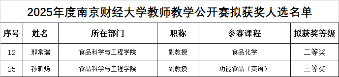 近日,南京财经大学2025年度教师教学公开赛评比结果正式揭晓,我院两位教师凭借出色的教学表现荣获佳绩。其中,邢常瑞老师主讲的《食品化学》课程荣获二等奖,孙昕炀老师主讲的《功能食品(英语)》课程荣获三等奖。