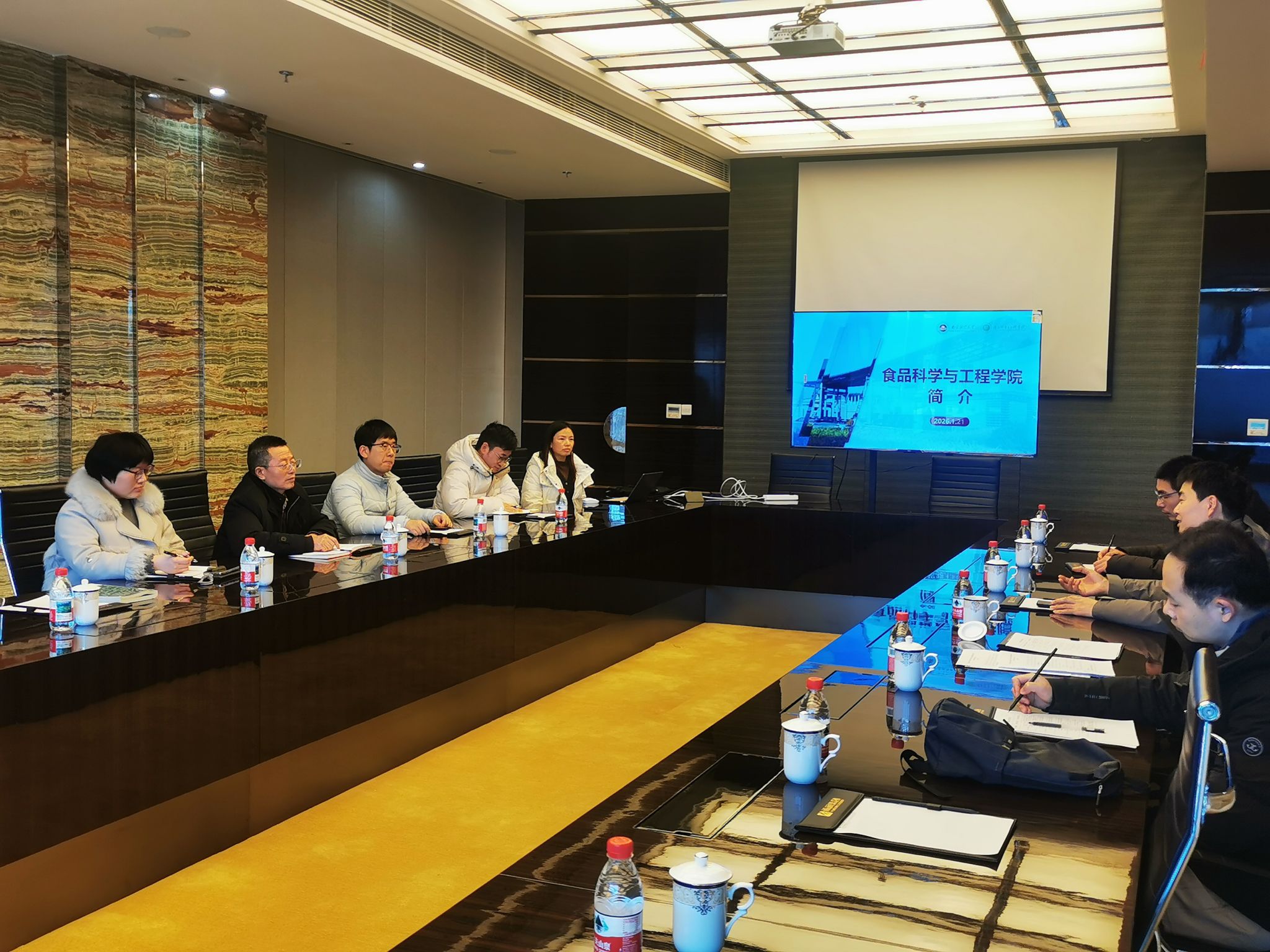 为深化产教融合、推动产学研协同发展,进一步提升人才培养质量和学科社会服务能力,拓宽学生就业渠道,1月21日下午,食品科学与工程学院院长唐培安,副院长李向菲,系主任邢常瑞、祁闯,肉品研发团队代表庄昕波等一行,赴中国雨润食品集团有限公司开展访企拓岗暨校企合作交流活动。雨润食品集团副总裁杨林伟,项目经理于倩倩,研发团队相关负责人热情接待了我院一行。