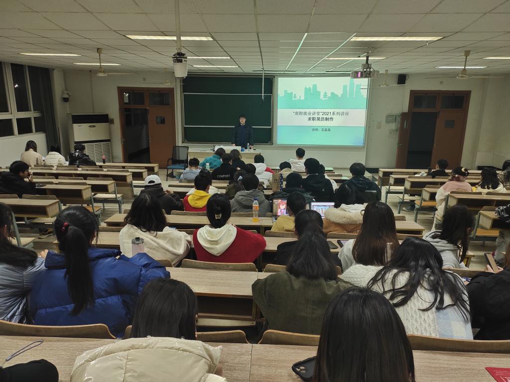 为了使即将实习的同学们在日后应聘工作时更加顺利,准备更加充分,由我校大学生就业与创业指导中心、食品科学与工程学院主办,校职业发展与就业协会协办的,南财就业讲堂系列讲座之 “简历制作与面试技巧”于12月3日18点至21点30分在仙林校区博远楼103教室顺利举办。我校150余名学生参加了此次讲座。