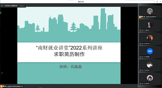 为了使即将实习的同学们在日后应聘工作时更加顺利,准备更加充分,由我校大学生就业与创业指导中心、食品科学与工程学院主办,校职业发展与就业协会协办的,南财就业讲堂系列讲座之 “简历制作与面试技巧”于4月28日18点至21点30分通过腾讯会议在线上顺利举办。我校150余名学生参加了此次讲座。