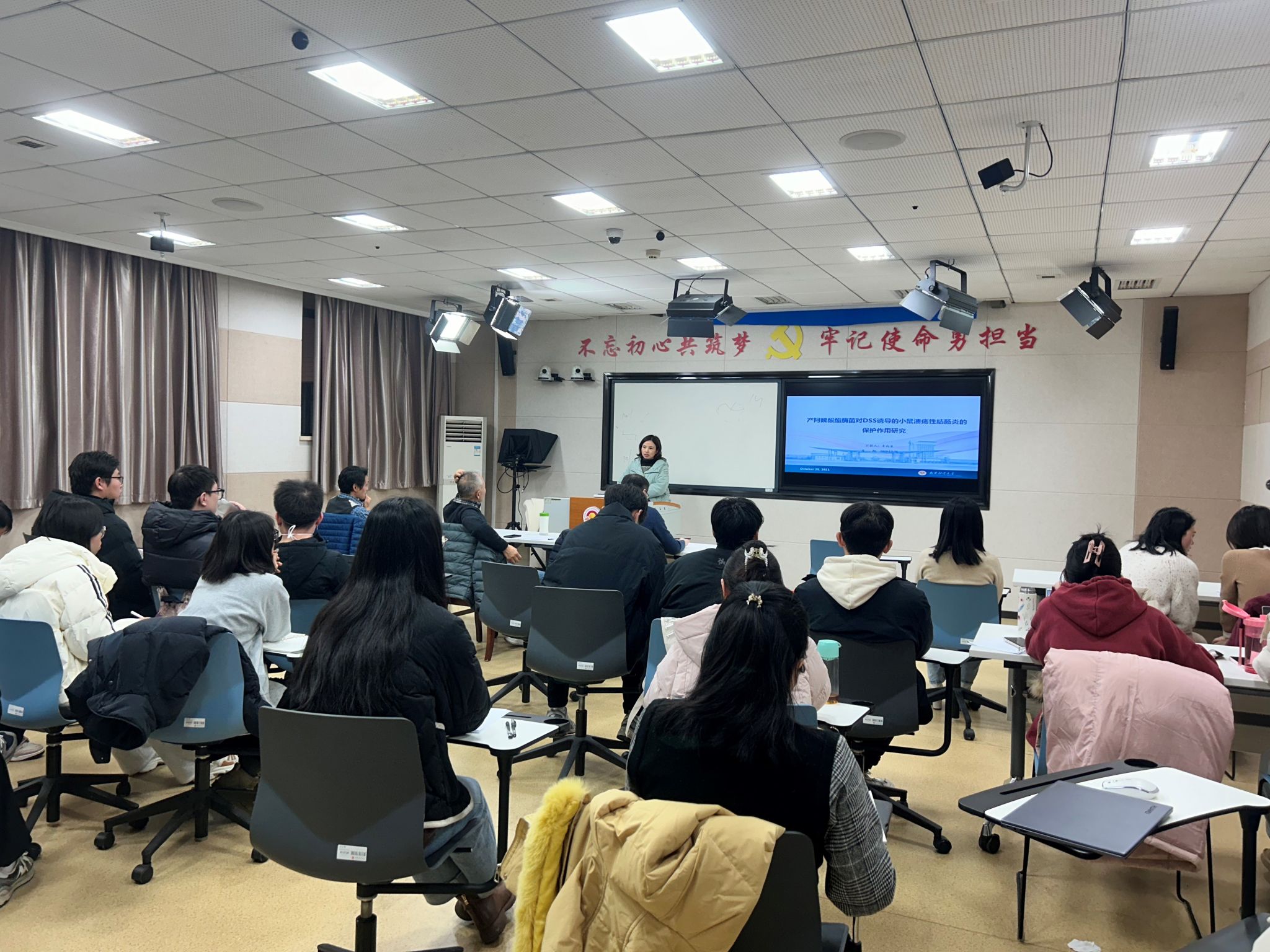 首先,熊玲老师、李向菲老师和王銮凤老师分别作了题为:“蛋白氧化致UHT 乳储藏期失稳机制与调控研究”、“产阿魏酸酯酶菌对DSS诱导的小鼠溃疡性结肠炎的保护作用研究”和“藜麦源纤维中隐生元的乳杆菌定向释放机制及其对肠道线粒体损伤的调节研究”的学术报告。在基金辅导环节,与会专家沈新春教授、陈银基教授和谢旻皓副教授针对三位老师申报基金的思路报告进行了细致、权威的指导,耐心解答了教师们在写作过程中遇到的困难,并重点传授了题目、摘要、立项依据、研究目标、研究内容、关键科学问题、研究方案及可行性、工作基础的写作经验。有针对性地帮助每位青年教师完善申报材料的底层逻辑、提升文字撰写能力。