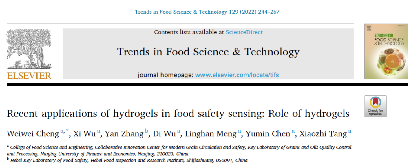 2022年10月9日,南京财经大学食品科学与工程学院汤晓智汤晓智教授课题组与河北食品检验研究院张岩研究员联合在食品国际顶尖学术刊物《Trends in Food Science & Technology》(Q1,IF=16.002)发表题为 “Recent applications of hydrogels in food safety sensing: Role of hydrogels” 的综述论文。该论文以南京财经大学为第一单位,程玮玮博士为第一作者。该项研究工作得到了国家重点研发计划、江苏省高等学校自然科学研究面上项目、南京市留学人员科技创新项目及江苏省高校优势学科建设工程项目的资助。