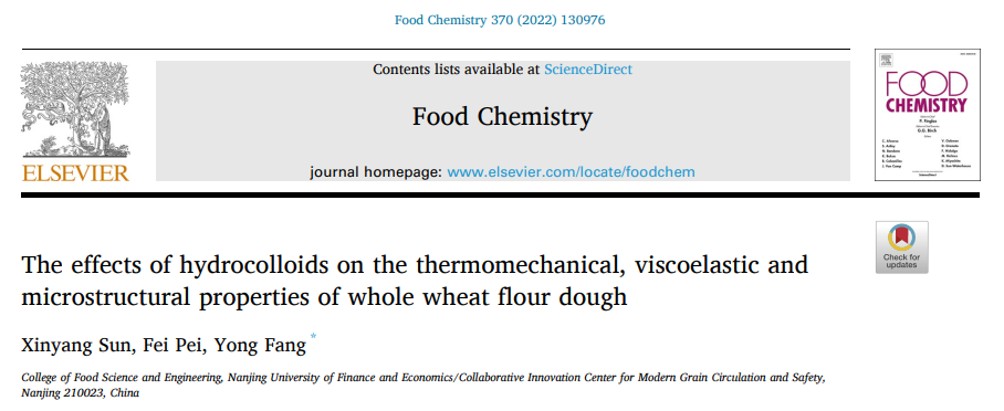 2022年2月15日,《Food Chemistry》发表了题为“The effects of hydrocolloids on the thermomechanical, viscoelastic and microstructural properties of whole wheat flour dough”的研究论文,该论文以南京财经大学为第一单位,孙昕炀博士为第一作者,方勇教授为通讯作者。该项研究工作得到了国家重点研发计划项目、江苏省自然科学基金与国家自然科学基金的资助。本研究通过综合探索亲水胶体对全麦面团热力学特性、粘弹性和微观结构特性的影响作用,为优化全麦面团加工工艺,改善全麦产品品质提供了科学方案。