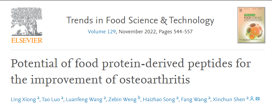 2022年11月9日,南京财经大学食品科学与工程学院沈新春教授课题组在食品国际顶尖学术刊物《Trends in Food Science & Technology》(Q1,IF=16.002)发表题为 “Potential of food protein-derived peptides for the improvement of osteoarthritis” 的综述论文。该论文以南京财经大学为第一单位,熊玲博士为第一作者。该项研究工作得到了国家自然科学基金面上项目、江苏省高等学校自然科学研究面上项目、江苏省高校优势学科建设工程项目的资助。