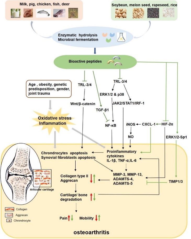 据报道,来自不同食品蛋白的生物活性肽具有多种生物活性,如抗炎和抗氧化等,在慢性疾病的干预及改善方面发挥着重要作用。骨关节炎是影响全球人类健康的主要疾病之一。骨关节炎的主要治疗方法是物理治疗、药物治疗和手术治疗。许多药物,如肾上腺皮质激素,对病人有严重的副作用。因此,寻找副作用更小的治疗方法迫在眉睫。最近,来自天然食物的生物活性肽在缓解骨关节炎症状的积极作用被广泛报道,使得它在功能食品的工业应用方面具有潜力。本文综述了食源性肽的生物活性,特别是对骨关节炎的改善作用以及潜在的分子机制。在现有的研究中,大部分改善关节炎的食源性活性肽来自动物蛋白,比如牛,鸡和鹿等。海产品是另一种重要的生物活性肽的来源。一些植物蛋白的摄入也被证明对骨关节炎症状具有缓解作用,但其水解物的作用尚未得到研究。尽管近年来植物蛋白在食品加工中的应用受到越来越多的关注,植物蛋白源活性肽在改善骨关节炎的研究仍不是很多,有待进一步开发。