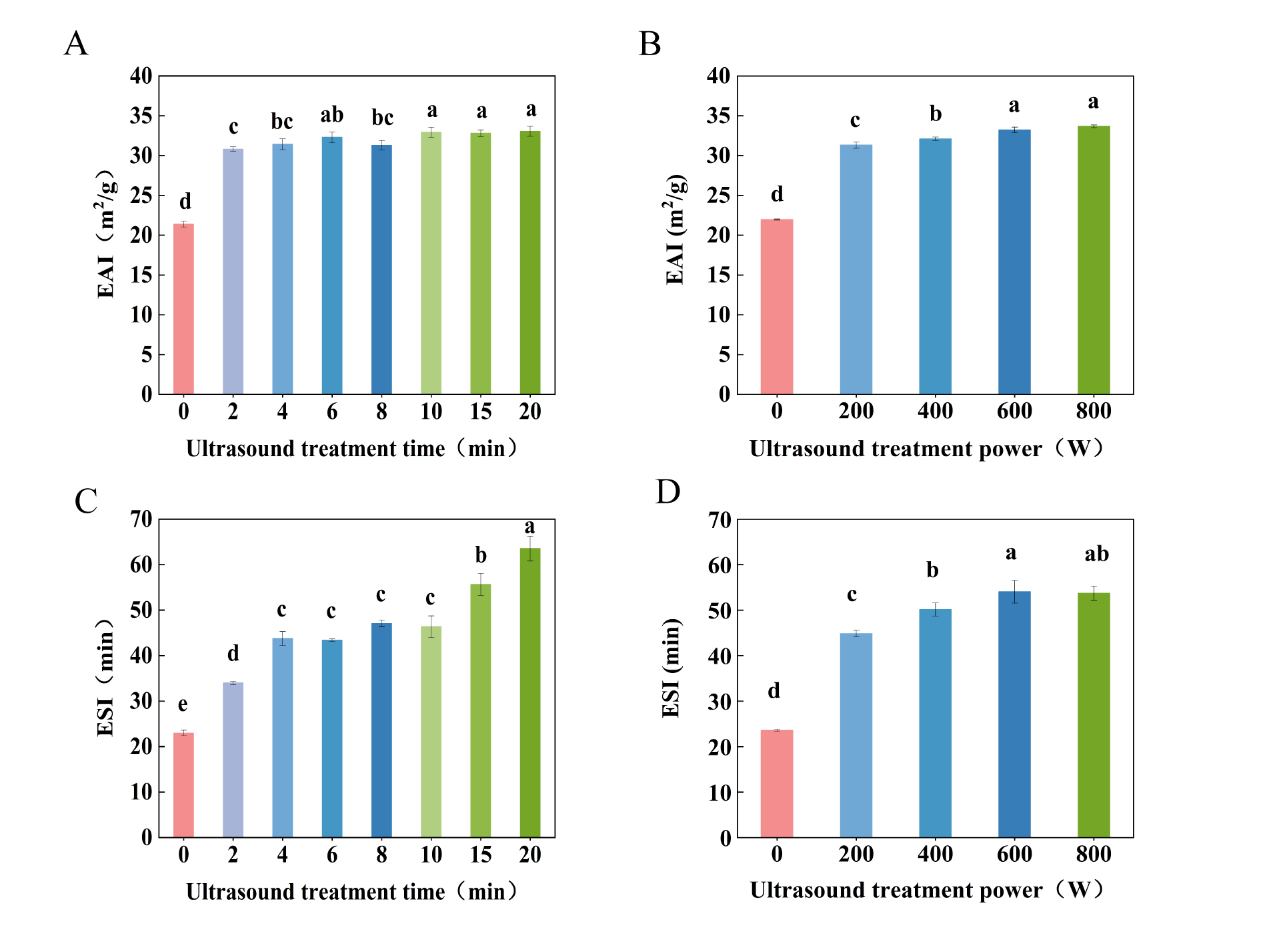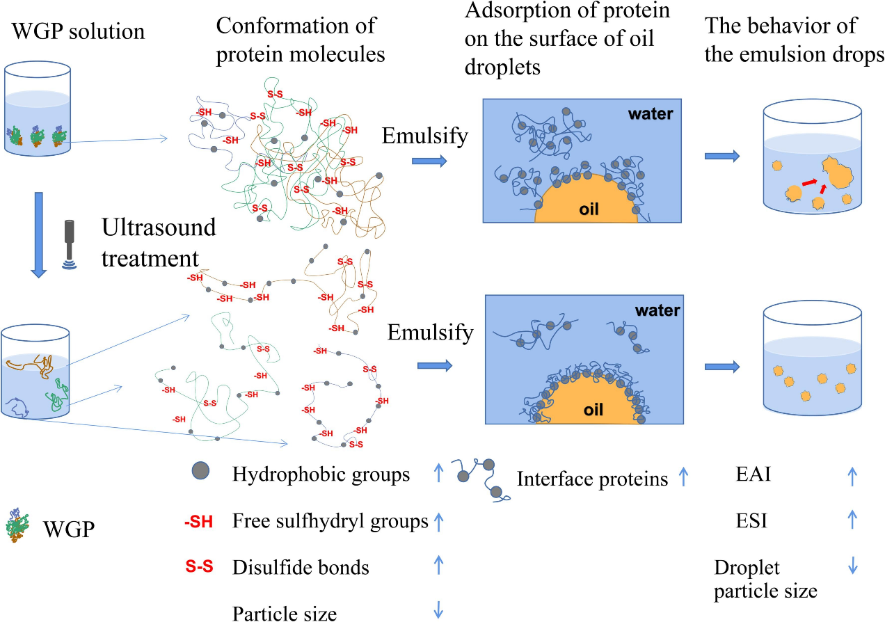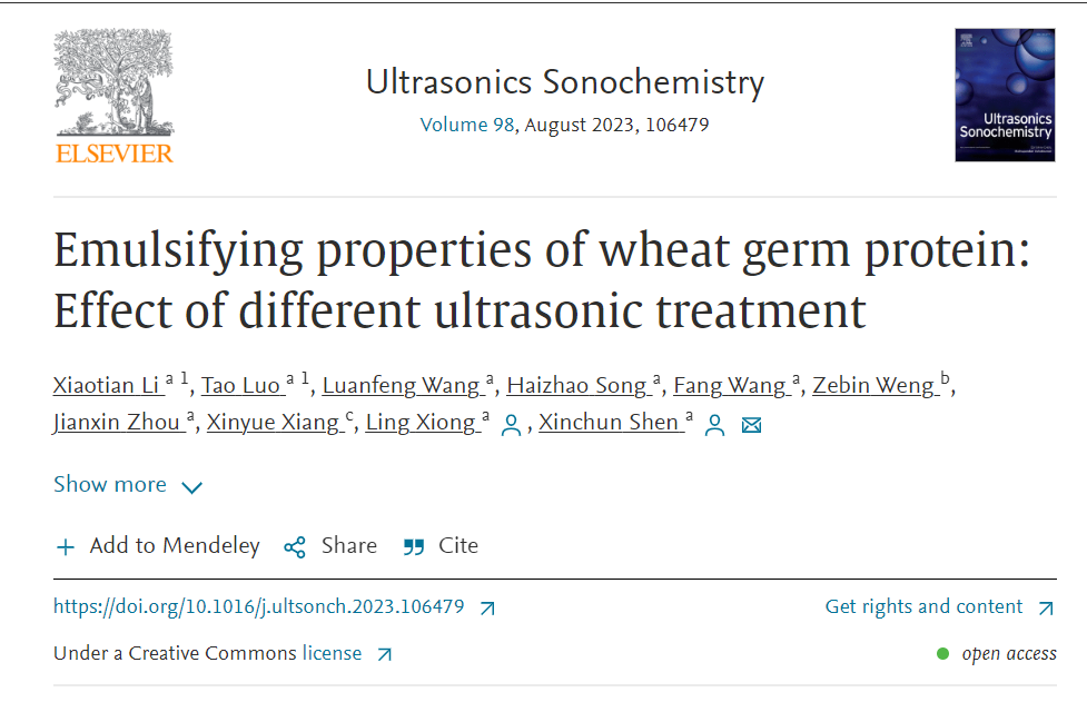 2023年8月1日,南京财经大学食品科学与工程学院沈新春、熊玲(通讯作者)在国际TOP期刊Ultrasonics Sonochemistry(Q1,IF: 8.4)发表题为“Emulsifying properties of wheat germ protein: Effect of different ultrasonic treatment”的研究性论文。