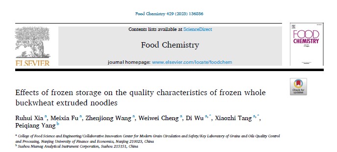 2023年7月13日,南京财经大学食品科学与工程学院汤晓智、吴迪(通讯作者)在国际TOP期刊Food Chemistry(Q1,IF: 8.8)发表题为“Effects of frozen storage on the quality characteristics of frozen whole buckwheat extruded noodles”的研究性论文。