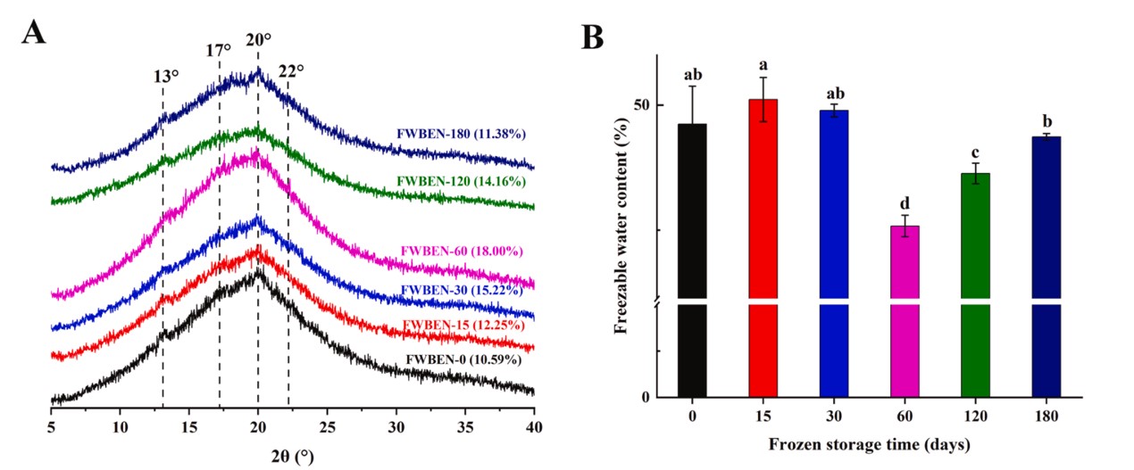 图1 冷冻储藏过程中全荞麦挤压面条的XRD图谱(A)和可冻结水含量(B)