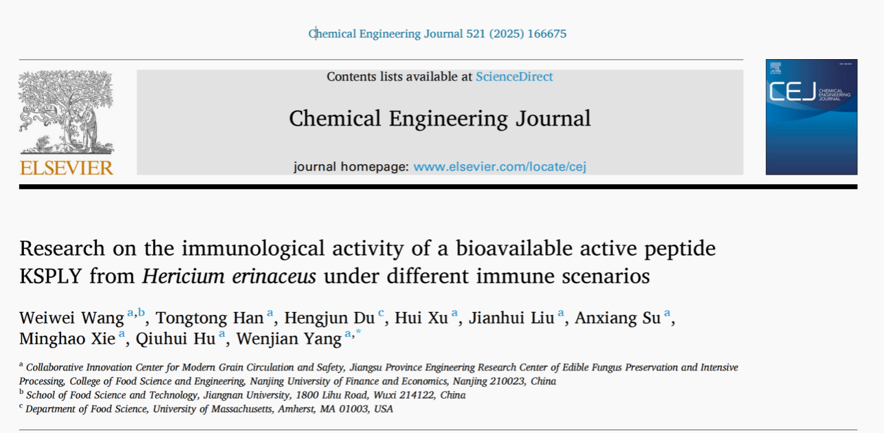 2025年8月,南京财经大学食品科学与工程学院杨文建教授团队在国际顶级期刊《Chemical Engineering Journal》(Q1,中科院1区Top,IF=13.2)发表题为“Research on the immunological activity of a bioavailable active peptide KSPLY from Hericium erinaceus under different immune scenarios”的研究性论文。南京财经大学硕士研究生王威威为论文第一作者,南京财经大学杨文建教授为论文通讯作者。