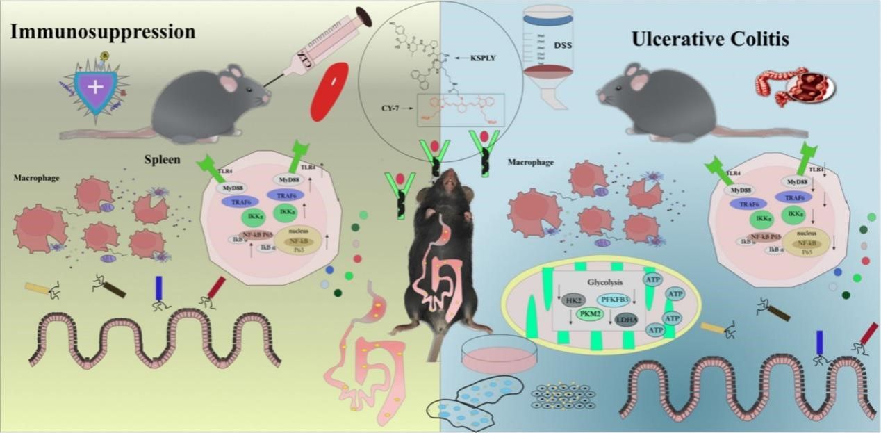 本研究对课题组前期提取、筛选的猴头菇生物活性肽KSPLY(Lys-Ser-Pro-Leu-Tyr)的免疫调节能力进行了评估。研究表明,KSPLY 表现出优异的生物利用度,该肽能够通过胃肠道而不发生降解,并被肠上皮细胞吸收。在环磷酰胺(CTX)诱导的免疫抑制小鼠模型中,KSPLY 通过作用于巨噬细胞、调节细胞因子分泌以及激活 TLR4/NF-κB 通路,恢复了小鼠的免疫功能。在葡聚糖硫酸钠(DSS)诱导的溃疡性结肠炎(UC)小鼠模型中,该肽可减轻炎症反应、增强肠屏障完整性,并调节巨噬细胞极化。在上述两种模型中,KSPLY 均能提高肠道微生物群的多样性并改善其组成,营造更健康的微生物环境。因此,KSPLY 有望成为一种天然免疫调节剂和功能性食品成分,用于辅助管理免疫相关疾病。