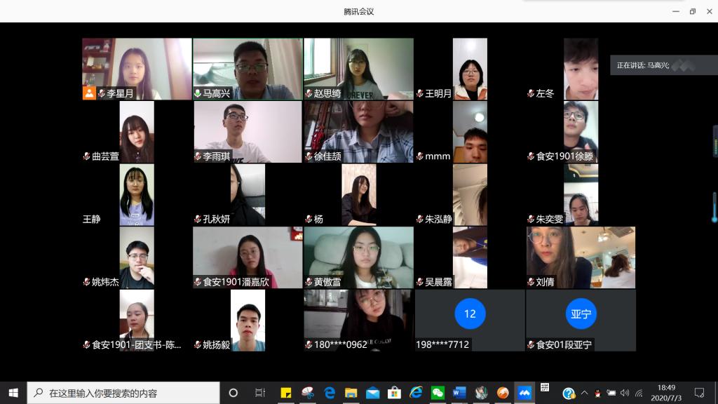 7月3日晚食安1901班召开线上班会,大家再次“见面”。本学期是最特殊的一学期,因为疫情,学校采取网课的方式进行教学。班主任马高兴老师强调,在这特殊时期,希望大家假期要注意安全,要注意防疫抗疫。马老师也希望大家在暑假期间认真复习巩固本学期学习内容,为下学期开学考试做足准备,愿每位同学都能考出理想成绩。同时也希望大家能总结这一学年的收获,制定更加明确的人生目标,也能为新一届的学弟学妹做好的榜样。马老师同时也鼓励大家积极参与报名自己感兴趣的实验项目,表示也会和感兴趣的同学分享自己实验时所拍的视频。