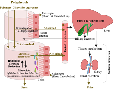 食品中广泛存在的多酚类物质,结构繁杂,难以经胃肠道消化与吸收,大部分直接到达结肠,与肠道菌群协作促进机体健康。从结构上讲,多酚在食品中以糖苷配基、糖苷或聚合物的形式存在。其中,只有糖苷配基能够在小肠中直接吸收,进入系统循环与各个器官发挥作用,最终从尿液中排出。而其余未吸收的多酚到达结肠经肠道菌群分解从而被人体吸收或随粪便排出。