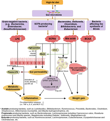 肥胖是由能量摄入和消耗不平衡引起的,主要特点为脂肪积累,并伴有慢性低度炎症。大量研究表明,宿主肠道菌群在调节高脂饮食(HFD)摄入与肥胖发病的相互作用中起着关键作用。肠道菌群组成的改变可能会影响宿主的能量稳态、全身炎症、脂质代谢和胰岛素敏感性。研究证实,多酚作为人类饮食中的主要成分之一,可以调节肠道菌群且缓解高脂饮食引起的肥胖,但其作用机制尚未系统阐释。