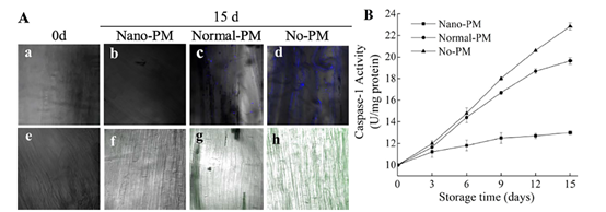 图1 不同包装对金针菇染色质浓缩和DNA损伤(A),Caspase-1活性(B)的影响