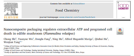 食品领域顶级期刊Food Chemistry在线发表了我院杨文建教授课题组题为“Nanocomposite packaging regulates extracellular ATP and programed cell death in edible mushroom (Flammulina velutipes)”的研究论文。该研究得到了国家自然科学基金(31871853)、江苏省优秀青年基金(BK20180092)以及江苏省教育厅重大项目(18KJA550002)的资助。