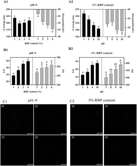 图1 不同条件对RBP NEs粒径和电位、乳化性的影响;RBP NEs的微观结构