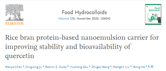 相关研究结果以“Rice bran protein-based nanoemulsion carrier for improving stability and bioavailability of quercetin”为题发表在Food Hydrocolloids杂志上,何荣副教授为通讯作者。本研究得到国家重点研发项目的资助。