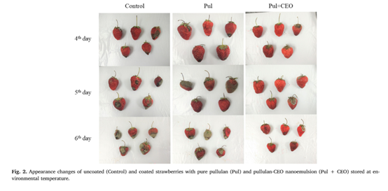 草莓果实营养丰富,拥有“水果皇后”的称号。然而,草莓成熟后表皮极薄,在采摘和储存过程中极易受到机械损伤与细菌霉菌侵染,通常情况下在常温放置3天即失水霉烂严重,失去商业价值。因此,如何维持新鲜草莓的品质,延长草莓的储藏时间一直以来都是国内外研究人员的热点问题。涂膜保鲜法因为具有操作简单易行、良好的气体选择透过性和有效防止微生物侵入等优势,成为近年来果蔬采后保鲜领域的热点研究方向。本研究以天然高分子可降解材料普鲁兰多糖为成膜基材,添加肉桂精油纳米乳液以提升复合膜的抗菌性能。对新鲜草莓涂抹保鲜的应用研究发现, 经过肉桂精油纳米乳液/普鲁兰多糖基复合膜液涂膜后的草莓,其在贮藏期结束时的重量损失、腐败率、硬度、可溶性固形物、可滴定酸和微生物指标均显著好于纯普鲁兰膜液组和对照组的草莓。实验结果表明草莓果实经过肉桂精油纳米乳液/普鲁兰多糖基复合膜液涂膜处理后,可以有效地延长贮存期,延缓衰老,并保持良好的外观品质,可见使用肉桂精油纳米乳液/普鲁兰多糖基复合膜液涂膜是一种极具潜力的保鲜手段。相关研究结果以“Improvement of storage quality of strawberries by pullulan coatings incorporated with cinnamon essential oil nanoemulsion”为题发表在LWT杂志上,我院本科生储艺夫为第一作者,汤晓智教授为通讯作者。本研究得到江苏高校优势学科建设工程项目的资助。