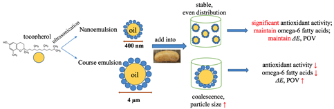 包埋维生素E的纳米乳液在鱼肠中的添加可以有效延缓鱼肉肠内油脂的氧化,并且对其中的不饱和脂肪酸起到保护作用。相比较而言,微米级的维E乳液添加对于鱼肠的脂肪氧化并没有显著的抑制作用。纳米乳液具有粒径小、分布均匀且较稳定的性质,促使维生素E发挥了显著的抗氧化作用。与此同时,研究发现纳米乳液的添加并不影响鱼肠的质构及色泽,可以广泛应用于食品工业生产中。相关研究结果以“Effects of tocopherol nanoemulson addition on fish sausage properties and fatty acid oxidation”为题发表在LWT杂志上,并入选农业科学领域ESI高被引论文。我院冯潇博士为第一作者,新加坡国立大学杨宏顺教授为通讯作者。