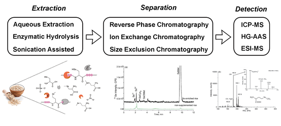 2021年4月,食品国际TOP学术期刊Comprehensive Reviews in Food Science and Food Safety(IF 9.9)发表了我院题为 “Selenium in cereals: Insight into species of the element from total amount” 的论文。该文系统地阐述了谷物中硒的含量和生物强化途径,论述了谷物中不同化学形态硒的分析流程和技术方法,揭示了硒的形态与其生物活性的关系,讨论了谷物来源的硒相关研究未来面临的主要问题和发展趋势。农作物因受到遗传品种、土壤条件、栽培方式以及加工方式的影响,导致谷物中硒含量变化范围较大,通过外源施用硒肥的方式可以大幅提高谷物籽粒中的硒含量。目前,最主要的谷物硒形态分析流程包括提取、分离和检测三个主要步骤,最常用的分析技术方法是通过温和适宜的酶促提取法获得各形态的硒,再用高效液相色谱(HPLC)联用电感耦合等离子体质谱(ICP-MS)分析定量硒的具体形态。谷物中含有无机硒(硒酸盐、亚硒酸盐)和有机硒,包括硒代甲硫氨酸(SeMet)和小分子硒肽等。有机硒比无机硒具有更好的生物利用度、更高的营养价值和更低的毒性,活性硒肽具有抗氧化、免疫调节、缓解重金属毒性等多种生理功能。谷物的硒形态以SeMet为主,还有多种活性硒肽,表明谷物是膳食硒的优良载体。文章强调在评价硒的营养健康作用,不仅仅考虑硒的摄入总量,而且也应考察硒的具体存在形态。因此,复杂样品中硒形态的高通量和快速高效的分析手段是未来的重要研究挑战,硒形态和生理功能的构效关系及其作用机理仍然是重要研究方向。