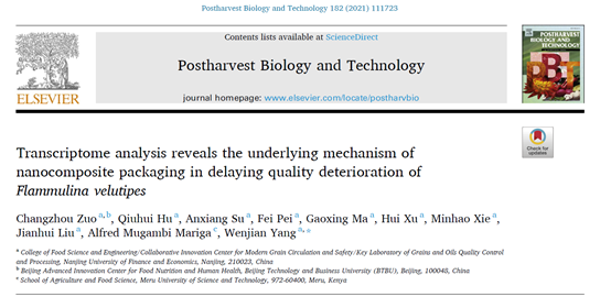 2021年9月9日,我院杨文建教授团队在食品领域TOP期刊Postharvest Biology and Technology上发表了题为“Transcriptome analysis reveals the underlying mechanism of nanocomposite packaging in delaying quality deterioration of Flammulina velutipes”的研究论文。南京财经大学为该论文第一单位,杨文建教授为通讯作者。本研究受到江苏省自然科学基金、国家自然科学基金以及江苏省高等学校自然科学研究项目的资助。