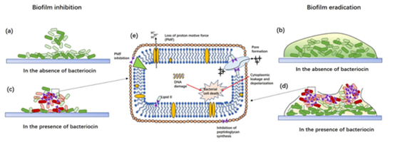 大多数食源性致病菌在生长过程均可产生生物膜。食品接触表面生物膜的生长可导致食品的反复交叉污染,带来严重的安全危害和经济损失。由于生物膜细胞对传统消毒剂具有极强的抗性,致病菌通常具有较强的生存能力。因此,开发抑制生物膜的形成、清除预先形成的生物膜的天然替代品成为近年来抗致病菌的研究热点。乳酸菌(LAB)产生的细菌素是核糖体合成的抗菌肽,是天然抗菌剂的重要来源,具有绿色、安全的优点。近年来,越来越多的研究发现细菌素拥有对常见致病菌(单核细胞增生李斯特菌、金黄色葡萄球菌、沙门氏菌和大肠杆菌等)生物膜的抗性。本综述系统地概述和评估了 LAB 细菌素在控制食品接触表面食源性致病菌的抗生物膜特性,具体讨论了产生细菌素的LAB 菌属/菌种、活性范围、测试方式(抑制和清除)和表面材料的影响,并探讨了细菌素抗生物膜的机制。研究结果表明,具有生物膜抗性的细菌素主要是由乳球菌、乳杆菌、肠球菌和片球菌产生。细菌素以剂量依赖性方式有效抑制生物膜的形成,但难以破坏预先形成的生物膜。细菌素对生物膜的抗性可能是抗菌、对细胞表面疏水性的干扰以及调控生物膜和群体感应相关基因共同作用的结果。通过与其他抗菌剂的协同组合、构建纳米复合物和生物工程的手段有助于增强细菌素的抗生物膜活性。本综述概述了食品加工环境中LAB 细菌素在抑制细菌生物膜方面的潜力和应用,有助于开发和广泛使用细菌素作为一种有前途的抗生物膜制剂。