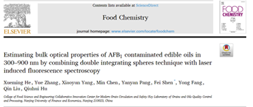 2022年5月1日,《Food Chemistry》发表了题为“Estimating bulk optical properties of AFB1 contaminated edible oils in 300–900 nm by combining double integrating spheres technique with laser induced fluorescence spectroscopy”的研究论文,该论文以南京财经大学为第一单位,何学明博士为第一作者,沈飞副教授为通讯作者。该项研究工作得到了国家重点研发计划项目、江苏省自然科学基金与国家自然科学基金的资助。