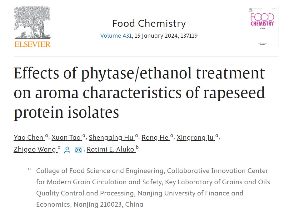 2024年1月15日,南京财经大学食品科学与工程学院王志高副教授(通讯作者)在国际TOP期刊Food Chemistry(Q1,IF: 8.8)发表题为“Effects of phytase/ethanol treatment on aroma characteristics of rapeseed protein isolates”的研究性论文。南京财经大学食品科学与工程学院22级研究生陈瑶为该论文的第一作者。