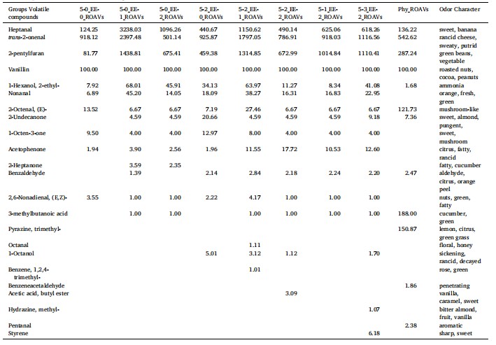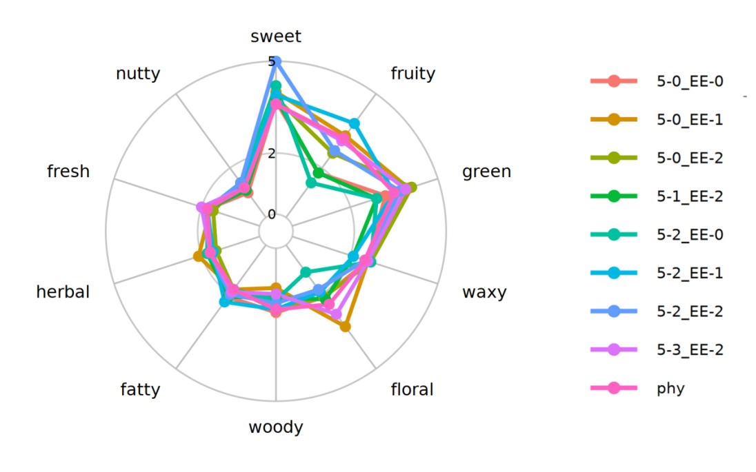 植酸酶和乙醇处理显著影响了菜籽分离蛋白中风味化合物的相对含量和整体风味特性。该处理不仅减弱了刺激性气味,还提升了令人愉悦的香气。处理过程中,具有强烈酸味的羧酸类化合物含量显著降低,而能够赋予菜籽分离蛋白水果和甜香味的酯类化合物含量显著增加。特别地,反式-2-壬烯醛、2-戊基呋喃和庚醛这三种化合物受植酸酶和乙醇处理的影响尤为突出,成为风味改善的关键因素。