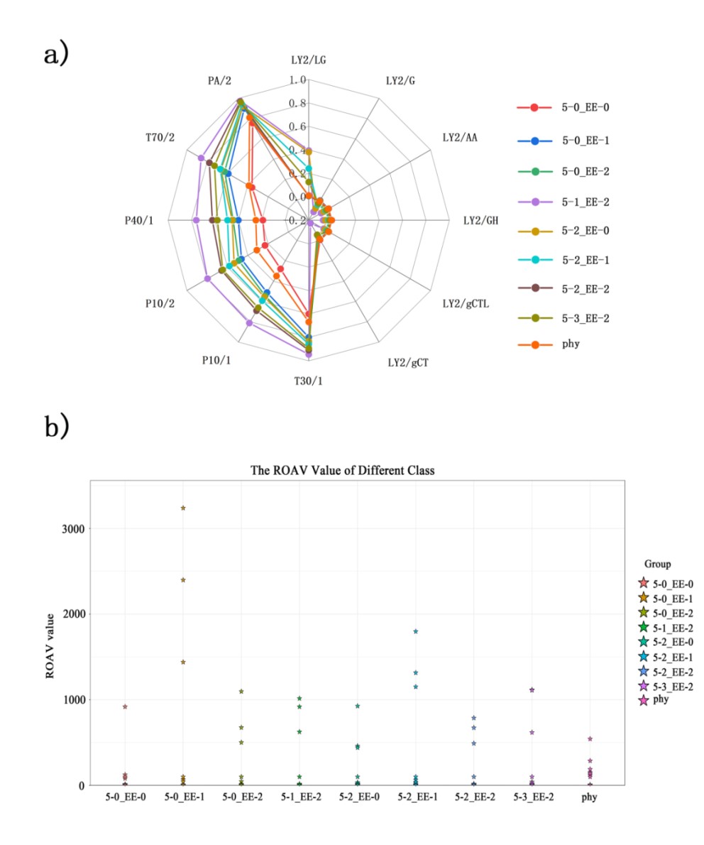 图3:不同菜籽分离蛋白中香气化合物的电子鼻分析(a)和ROAV值分析(b)