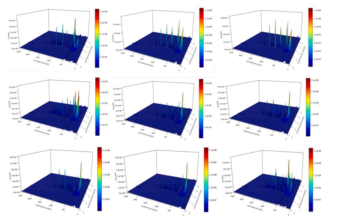 图1:不同菜籽分离蛋白样品中挥发性化合物的三维总离子色谱图