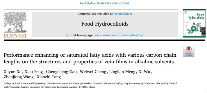 2024年5月,南京财经大学食品科学与工程学院汤晓智教授课题组在期刊Food Hydrocolloids(Q1,IF: 11)发表题为“Performance enhancing of saturated fatty acids with various carbon chain lengths on the structures and properties of zein films in alkaline solvents”的研究性论文。