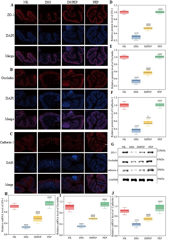 图4 ZO-1(A)、occludin(B)和cadherin-1(C)的免疫荧光图像;紧密连接蛋白的免疫印迹分析(D-G)和mRNA表达水平(H-J)。