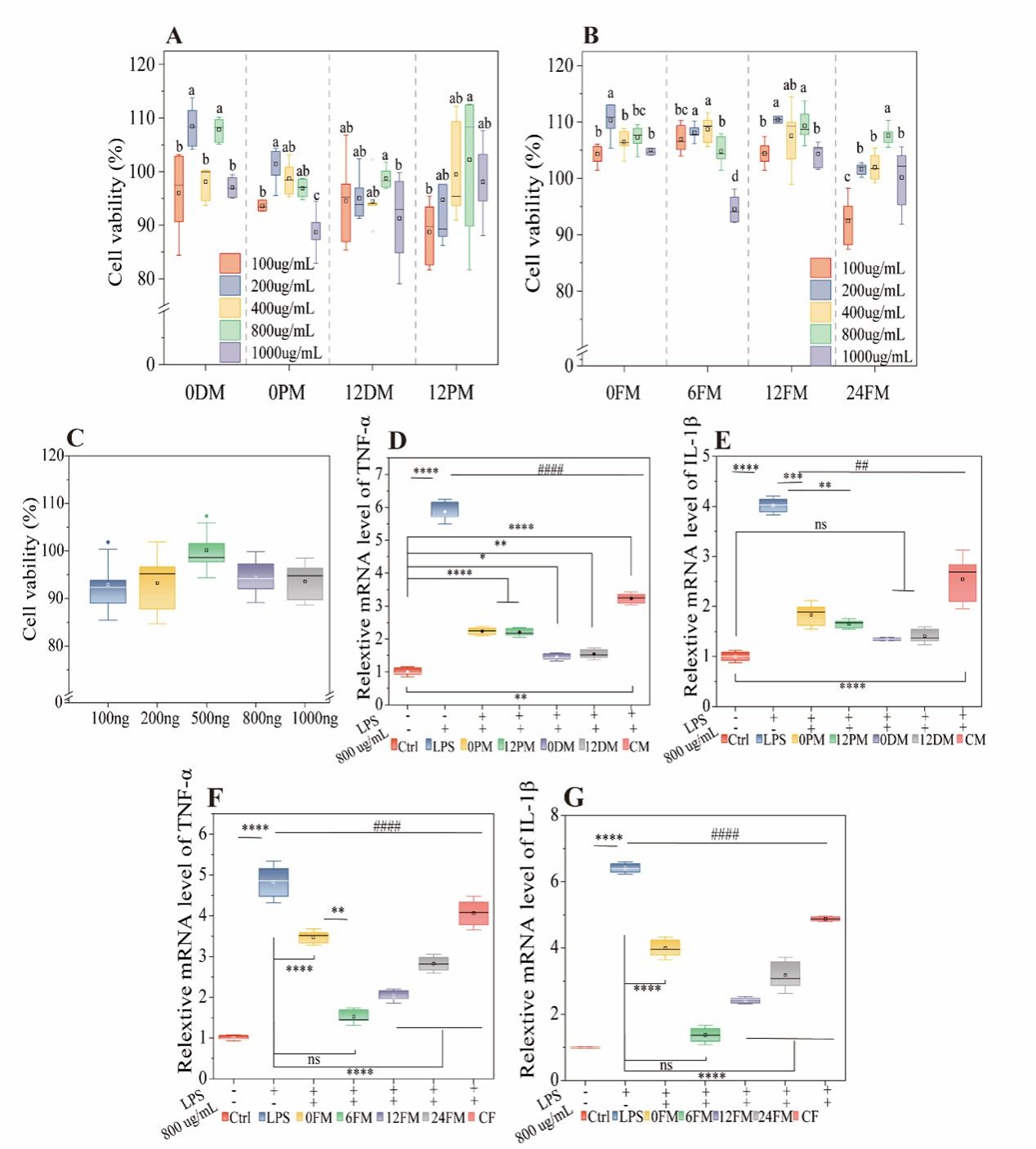 图1各组的细胞活力比较(n=8)(A-C)。复合物对炎症因子的影响,消化产物和粘蛋白复合物(D-E);发酵产物和粘蛋白复合物(F-G)。