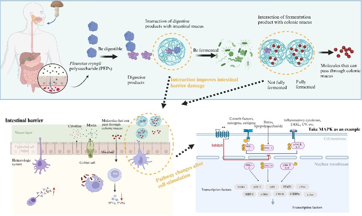 杏鲍菇多糖(Pleurotus eryngii polysaccharides, PEPs)是一种具有丰富功能活性的食源性菌物多糖,研究初期,团队深入分析了具PEPs的免疫调节活性,并研究了PEPs在体内和体外的消化和发酵特性,进而利用葡聚糖硫酸钠(DSS)诱导的小鼠肠炎模型观察了PEPs与肠道微生物群之间的相互作用对结肠炎的改善作用,但并未对相关机制进行深入解析。