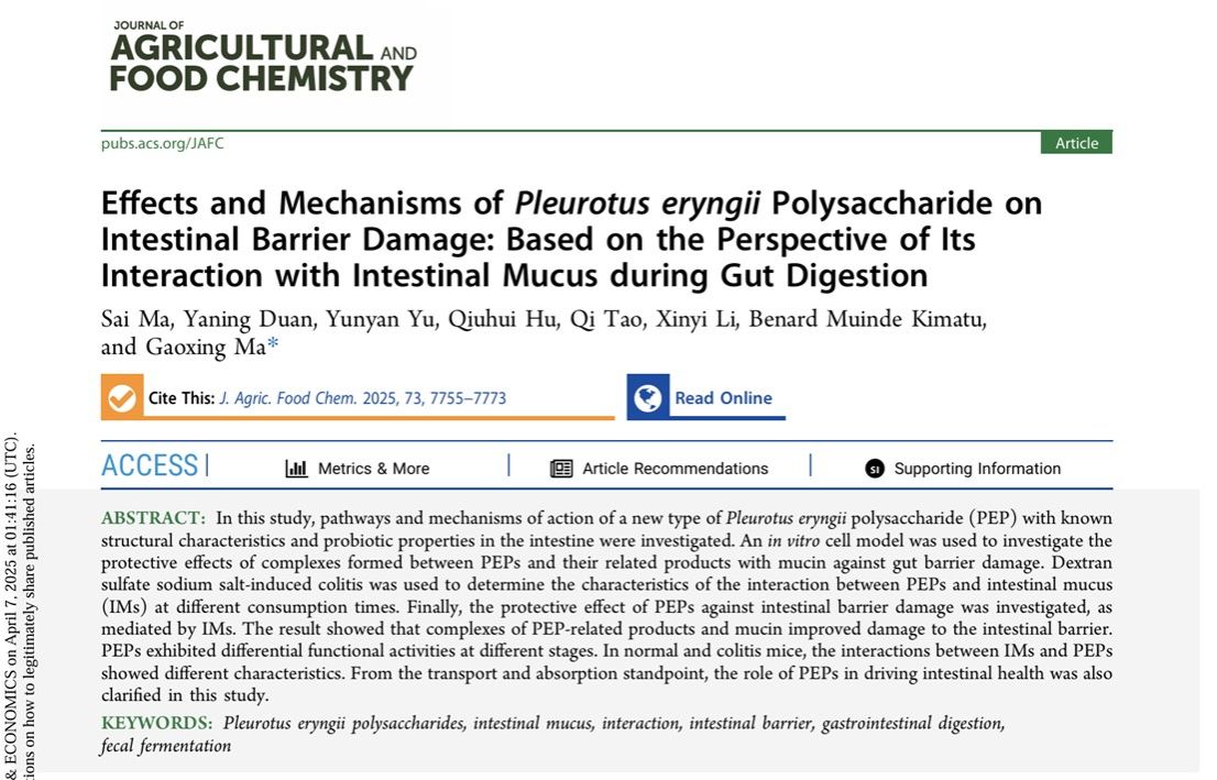 2025年3月20日,南京财经大学食品科学与工程学院2021级硕士研究生马赛(第一作者),马高兴教授(通讯作者)在国际TOP期刊Journal of Agricultural and Food Chemistry (Q1,IF: 5.7)发表题为“Effects and Mechanisms of Pleurotus eryngii Polysaccharide on Intestinal Barrier Damage: Based on the Perspective of Its Interaction with Intestinal Mucus during Gut Digestion”的研究性论文。