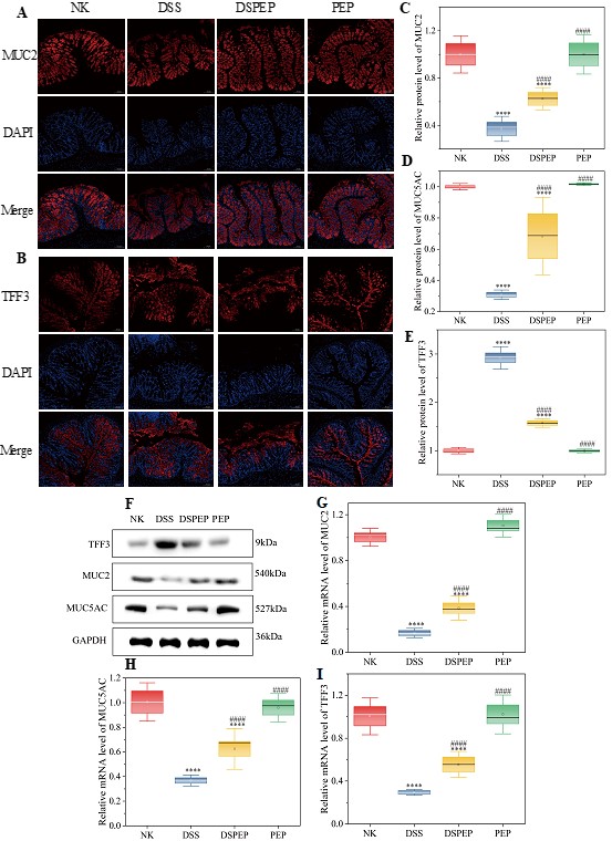 IMs和PEPs之间的相互作用会导致PEPs的结构发生变化,从而改变其在肠道中的功能活性作用途径。具体来说,Ims稳态对PEPs改善DSS诱导的肠道屏障损伤影响显著,表现在肠道通透性、粘蛋白和TJs蛋白分泌增加,以及NF-κB和MAPK通路中关键蛋白的磷酸化减少。