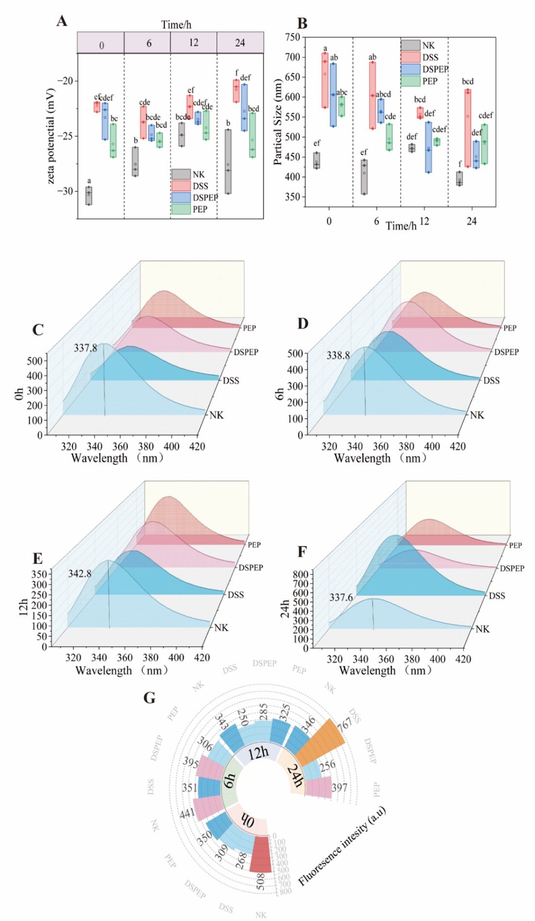 图2 不同摄入时间的肠粘液和多糖复合物的体内相互作用特征。Zeta 电位(A);粒径(B);荧光光谱(C-F);荧光强度(G)。